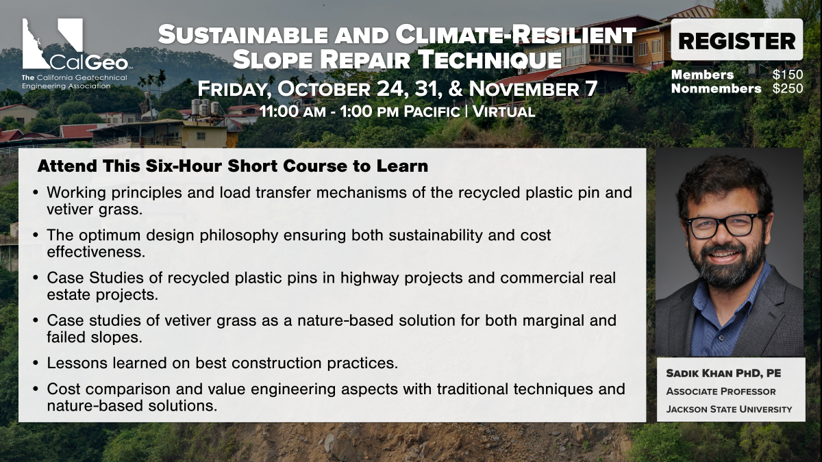 Members: $350 | Non-Members: $500 Sustainable and Climate-Resilient Slope Repair Technique DETAILS AI Meets Soil: Redefining Liquefaction Analysis with GeoLiquefy Hutchinson Island Ferry Bulkhead Collapse Induced Seismicity Hazard Assessment for the Energy Industry Geotechnical + Structural Engineers | Optimizing Project Planning Liquefaction Assessment of Gravelly Soils Based on In-Situ Testing Numerical Modeling 2025 (2 hours)