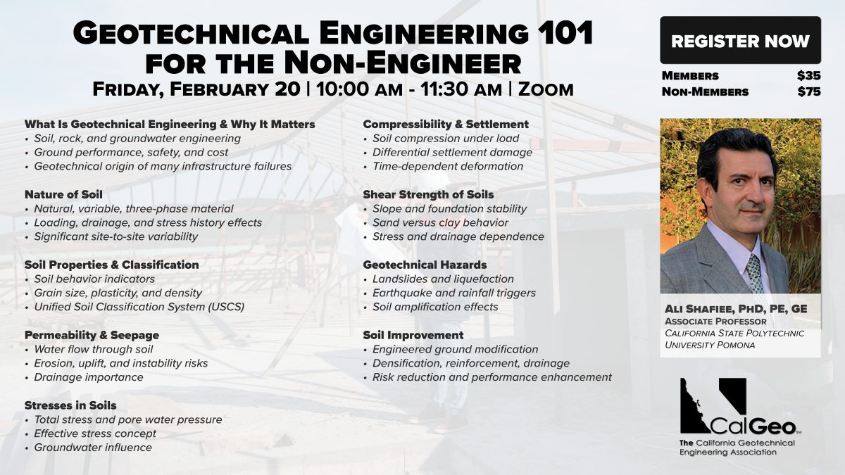 Members: $350 | Non-Members: $500 Geotechnical Engineering 101 for the Non-Engineer OSHA Compliance Training for Geoprofessional Field Staff Applications of Cone Penetrometer Testing in Dams and Levees Prevailing Wage & Related Updates Practical and Tactical Solutions Sustainable and Climate-Resilient Slope Repair Technique DETAILS AI Meets Soil: Redefining Liquefaction Analysis with GeoLiquefy Hutchinson Island Ferry Bulkhead Collapse Induced Seismicity Hazard Assessment for the Energy Industry Geotechnical + Structural Engineers | Optimizing Project Planning Liquefaction Assessment of Gravelly Soils Based on In-Situ Testing Numerical Modeling 2025 (2 hours)